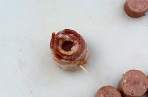 Cut bacon strips in half. Wrap bacon around the sausage, creating a bowl and secure with a toothpick.