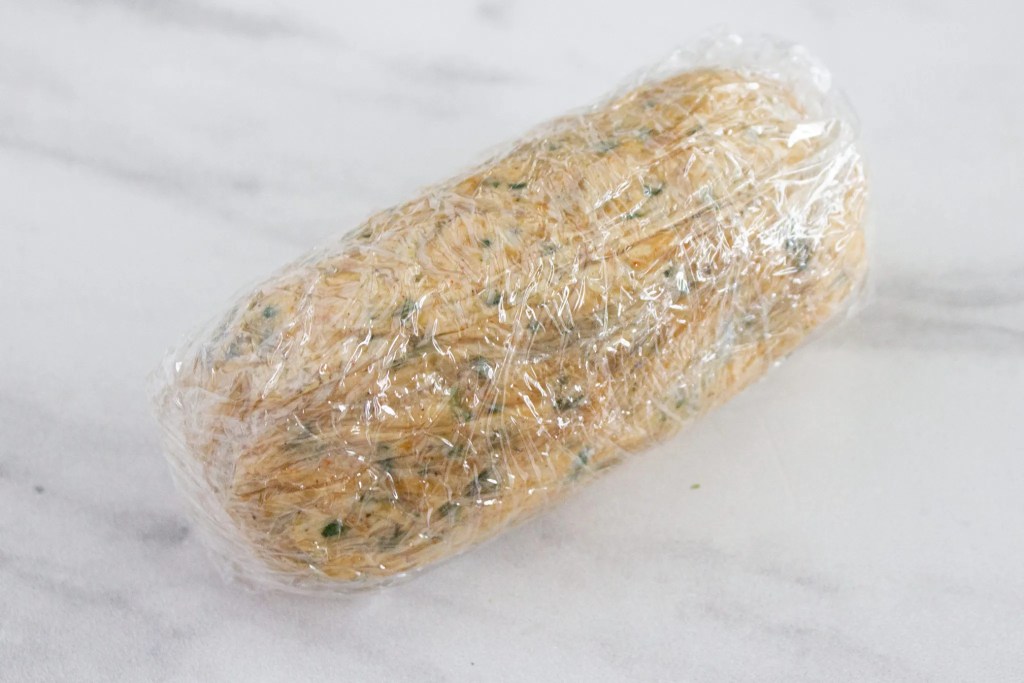 To make the butter log of cowboy butter, lay out a long piece of plastic wrap and scoop the butter into the center of the wrap