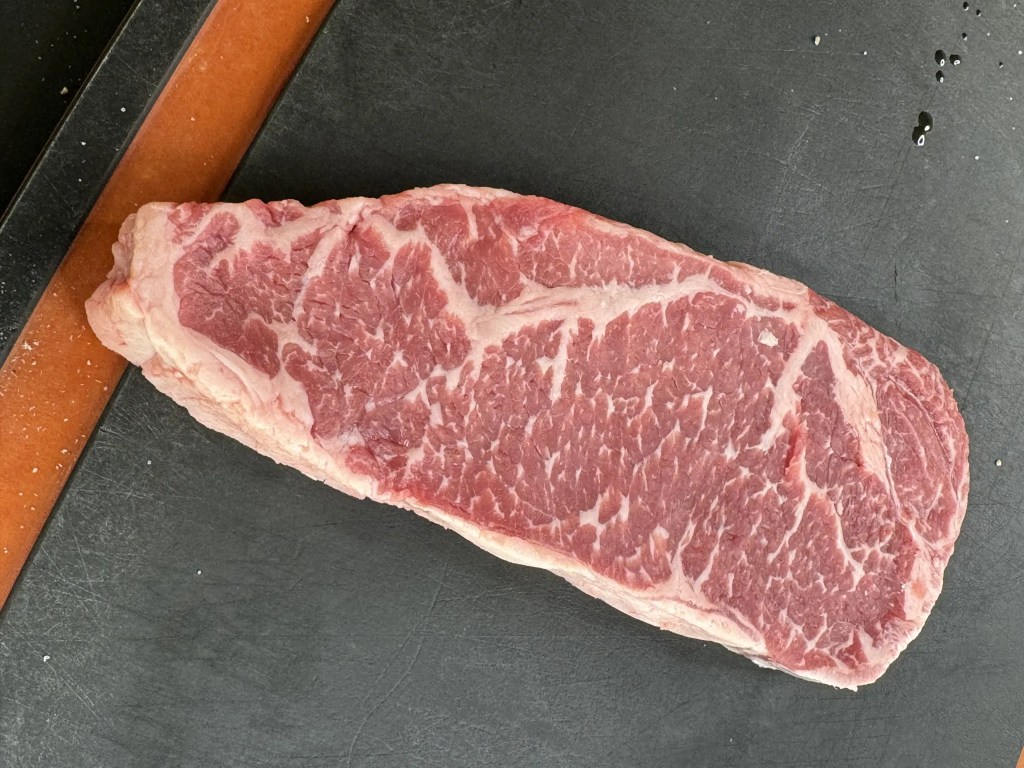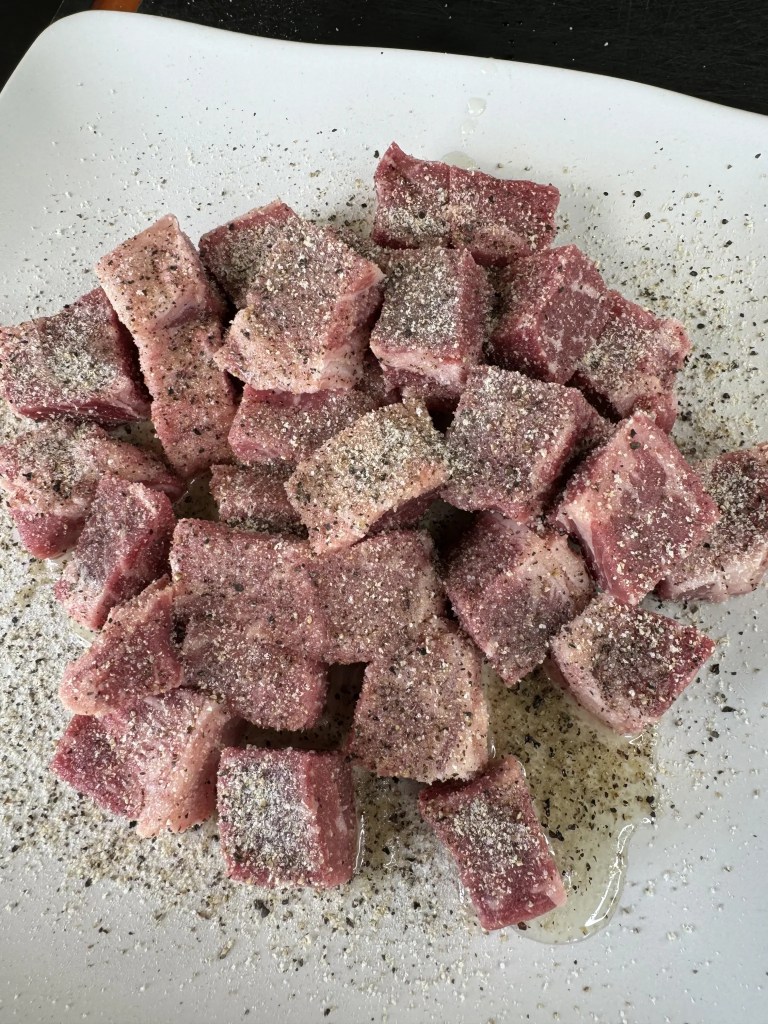 - Cut the NY Strip steaks into 1″ thick cubes.