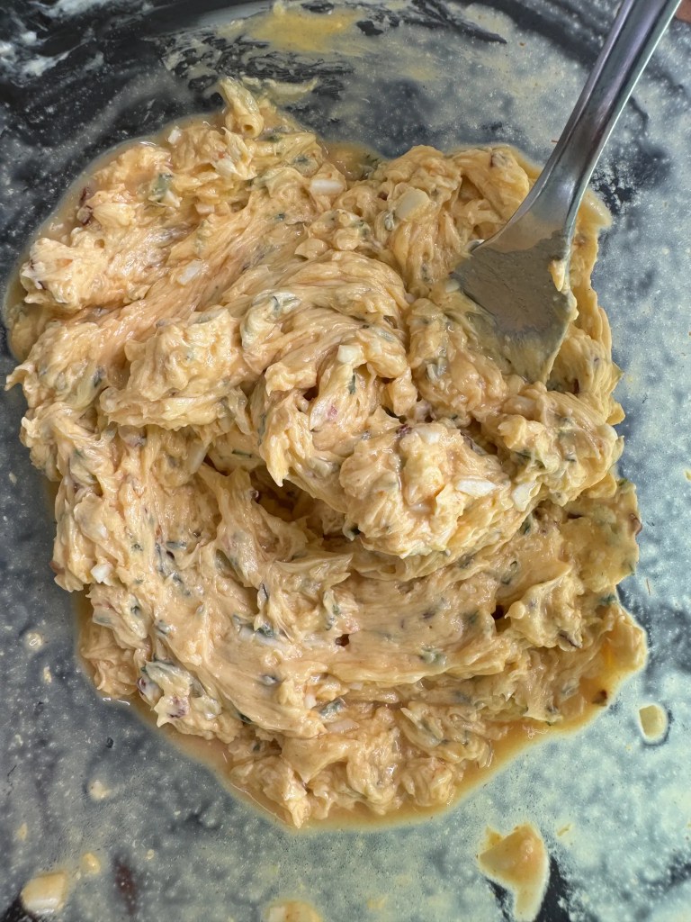 - In a medium mixing bowl, combine softened unsalted butter, minced garlic, Dijon mustard, hot sauce, fresh chopped parsley, fresh thyme, fresh rosemary, lemon juice, kosher salt, black pepper, and red pepper flakes.